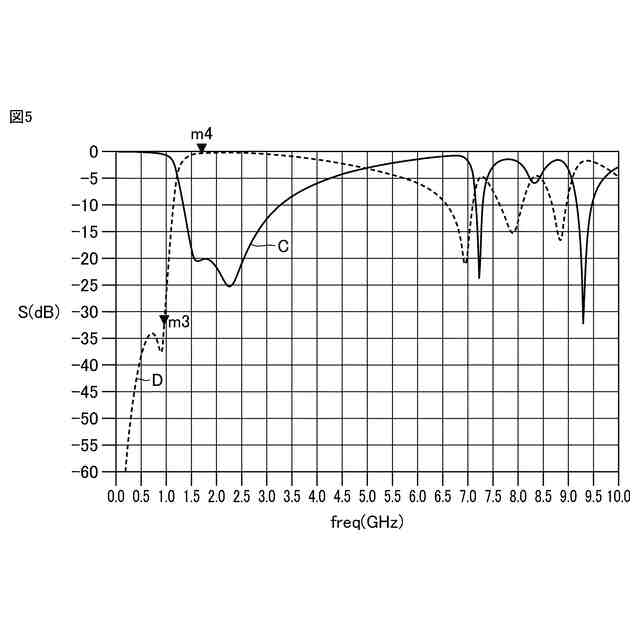 実施の形態1に係るフィルタ装置のハイパスフィルタの伝送特性を示すグラフである。