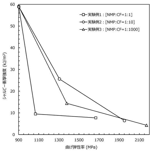 実験例1~3に関する曲げ弾性率とシャルピー衝撃強度との相関を表すグラフである。