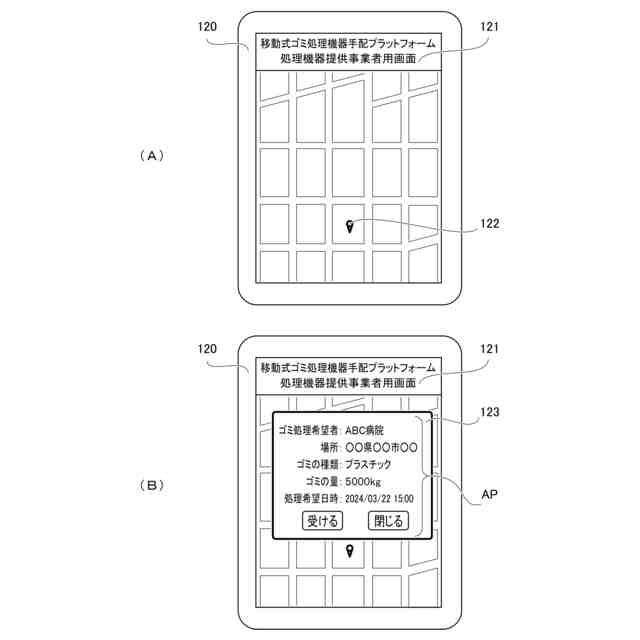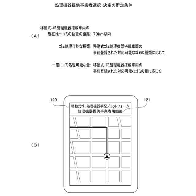 本請求項1に係る発明は、ゴミ排出事業者端末と、ゴミを加熱処理または粉砕処理して減容ないし資源化する移動式ゴミ減容・資源化処理機器搭載車両をゴミの場所へ提供する処理機器提供事業者の処理機器提供事業者端末とをオンラインで繋げる移動式ゴミ処理機器手配プラットフォームのプログラムであって、サーバがゴミ排出事業者端末からゴミ処理の申込みを受けるゴミ処理受注ステップと、前記処理機器提供事業者端末にゴミ処理の申込み情報を表示させる申込み案件表示ステップと、所定条件に基づいて処理機器提供事業者を決定する決定ステップと、前記処理機器提供事業者の移動式ゴミ減容・資源化処理機器搭載車両と共に移動する処理機器提供事業者端末に対してゴミ排出事業者のゴミの位置情報を送信して案内する案内ステップと、前記移動式ゴミ減容・資源化処理機器搭載車両がゴミの減容・資源化処理を実行開始したことをサーバが受信する処理実行開始確認ステップとを有していることにより、前述した課題を解決するものである。