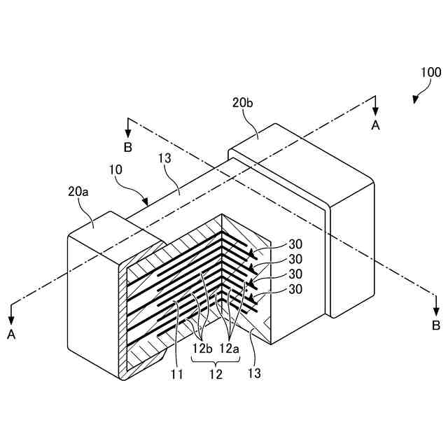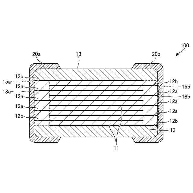 図1は、本開示の一態様に係る積層セラミックコンデンサの一例の部分断面斜視図である。図2は、図1のA-A線断面図である。図3は、図1のB-B線断面図である。図1~図3で例示するように、積層セラミックコンデンサ100は、略直方体形状を有する積層チップ10と、積層チップ10のいずれかの対向する2端面に設けられた外部電極20a,20bとを備える。なお、積層チップ10の上記2端面のうち、一方を第1の端面と称し、もう一方を第2の端面と称する。第1の端面および第2の端面は、積層チップ10の端面のうちの1端面であれば、どちらの面が第1の端面18aまたは第2の端面18bであってもよい。第1の端面18aおよび第2の端面18b以外の4面のうち、積層方向の上面および下面以外の2面を側面と称し、一方を第1の側面と称し、もう一方を第2の側面と称する。第1の側面および第2の側面は、積層チップ10の側面であれば、どちらの面が第1の側面19aまたは第2の側面19bであってもよい。なお、積層方向にある端の面を上面又は下面としているため、積層チップ10の上面は上側に特定されるものでなく、積層方向にある端の面であれば、どちらの面が上面であっても下面であってもよい。外部電極20a,20bは、積層チップ10の積層方向の上面、下面、第1の側面19aおよび第2の側面19bに延在している。ただし、外部電極20a,20bは、互いに離間している。