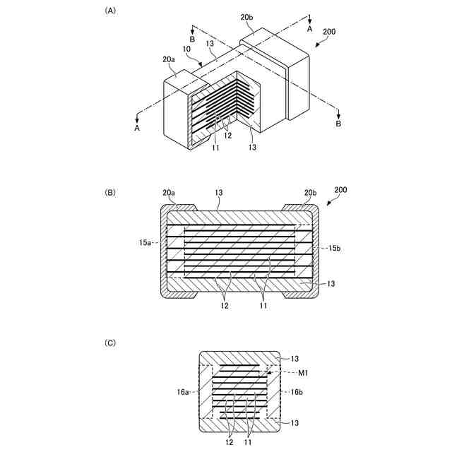 図4(A)は、凸部を有しない積層セラミックコンデンサの部分断面斜視図であり、図4(B)は、図4(A)のA-A線に沿った断面図であり、図4(C)は、図4(A)のB-B線に沿った断面図である。