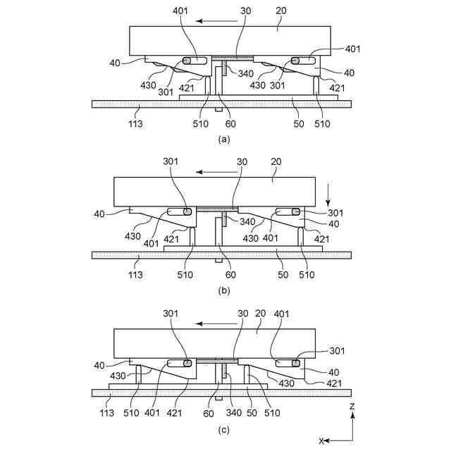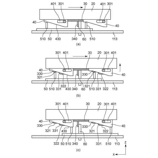 しかしながら、カム部材を有する機構は、カム部材がキャリッジに対して相対移動する際に大きい音が発生する虞がある。それを防止するためにカムの傾斜面を緩やかにする構成とすることも可能だが、傾斜面を緩やかにすることでカム部材の長さが増大し、装置サイズが大きくなる虞があった。