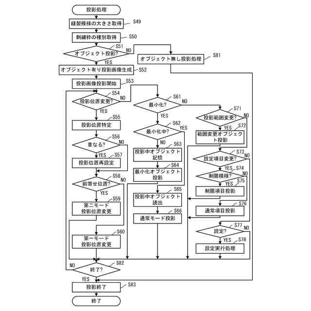 従来のミシンでは、縫製領域、刺繍枠、及び投影領域の形状によっては、設定オブジェクトを投影するスペースが十分に確保できない場合がある。したがって、従来のミシンでは、投影された設定オブジェクトの視認性が損なわれることがある。