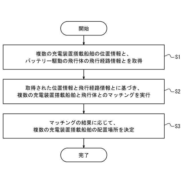従来、バッテリー駆動の飛行体の飛行経路に海上を含む場合における、飛行体への海上での充電方法については検討されていなかった。つまり、バッテリー駆動の飛行体に係る海上での充電技術には改善の余地があった。