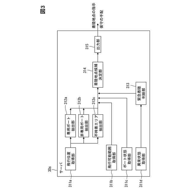 記憶されている複数の前記非専用ポート位置情報と、取得した前記飛行位置情報とに基づいて、複数の前記非専用ポートの中から少なくとも1つを抽出する非専用ポート抽出部(312b)と、