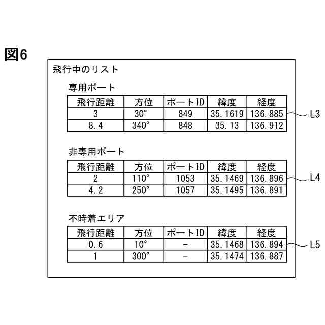 第1実施形態において、飛行中に抽出された専用ポート、非専用ポートおよび不時着エリアのリストを示す図である。
