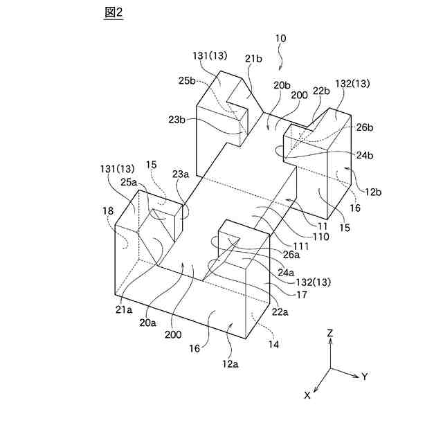 前記鍔部は、前記第1端子電極と前記第2端子電極との間において、前記実装面から凹む凹部を有し、