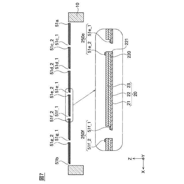 複数の前記積層体が複数の直列回路を形成するように、少なくとも一つの前記導電パターンによって、前記第1方向に配列された複数の前記積層体は直列に電気的に接続され、