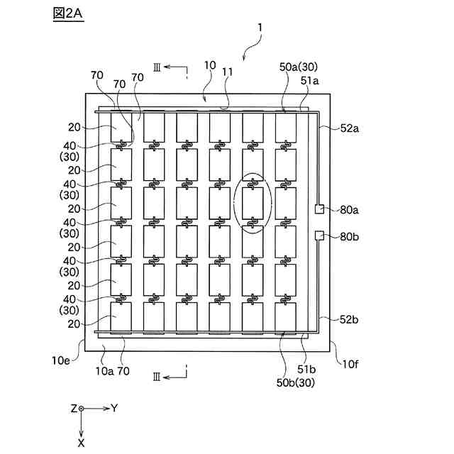 複数の前記積層体は、前記積層方向に垂直な第1方向と、前記積層方向および前記第1方向に垂直な第2方向とに配列され、