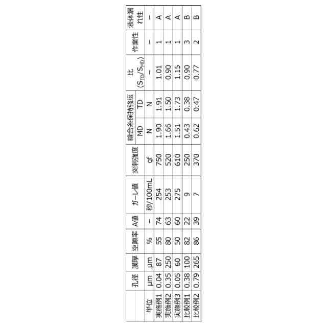 しかしながら、特許文献2に記載のポリオレフィン多孔膜では、フィルム内の細孔がエラストマーにより部分的に充填されており、当該充填箇所の強度は高いものの、充填箇所以外の箇所で縫合を行った場合、十分な強度を得ることができない。そのため、多孔膜における強度の高くない箇所から引裂き及び早期破損が促進又は誘発され、多孔膜の破損部や針孔からの液体の漏れの発生を十分に防止できないことがある。
