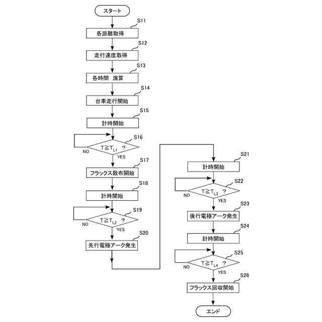 複数の電極を用いたサブマージアーク溶接においては、溶接開始時のいわゆるランニングスタートが知られている。ランニングスタートでは、まず、先行の電極がアークの発生を開始し、その直後に各電極を搭載した台車の走行が開始する。そして、後行の電極は、先行の電極のアークによって被溶接物に形成された溶融池上に到達したときに、アークの発生を開始する。