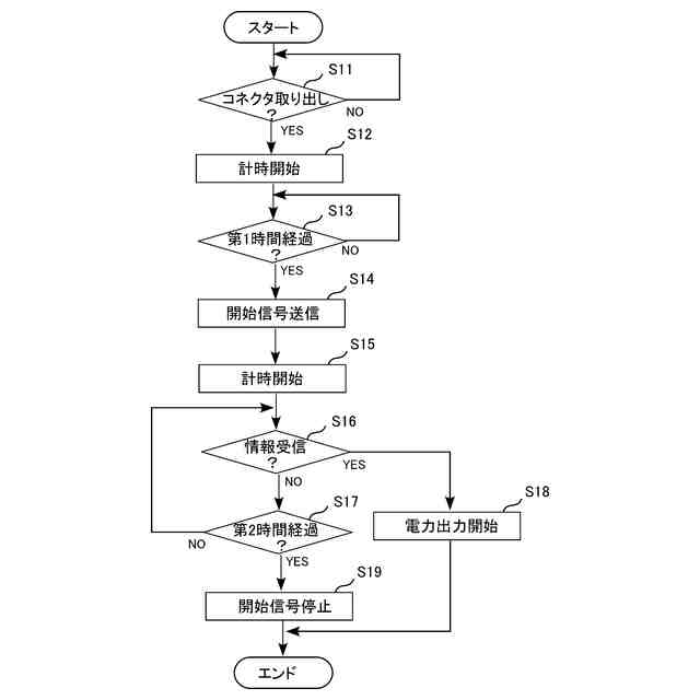 本発明の好ましい実施の形態においては、前記充電コネクタが操作者によって把持されているか否かを検出する第2検出部をさらに備え、前記制御部は、前記検出部の検出結果が前記収納状態から前記非収納状態に変わった後、前記第2検出部が、把持されていない状態を検出したときに、前記信号送信部を前記非送信状態から前記送信状態に切り替える。