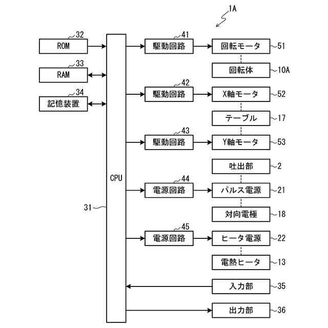 回転可能な軸と、前記軸から前記軸に交差する交差方向へ突出する突起とを有し、前記吐出部に収容され、回転することで前記粘性流体を前記ノズルから前記対向電極に向かう吐出方向へ押し出す回転体であって、前記電圧を印加する前記電源と協働して前記ノズルから前記粘性流体を吐出する回転体と、を備えること