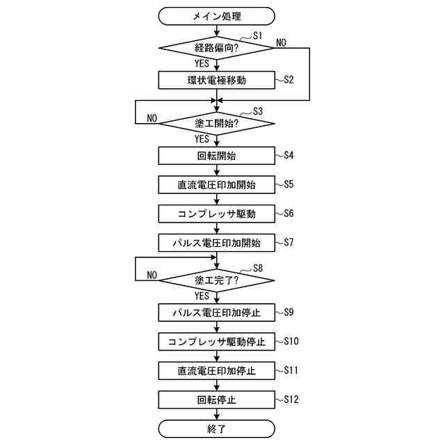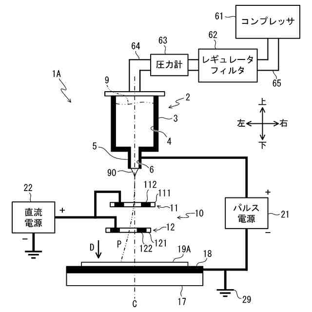 【解決手段】塗工装置1Aにおいて、パルス電源21はノズル5と対向電極18との間で電圧を印加する。直流電源22は環状電極10の電極112及び電極122に電圧を印加する。環状電極10の第1環状電極11及び第2環状電極12は、液滴90の経路Pの周りに配置される。第1回転モータは第1環状電極11を回転させる。第1環状電極11は第1環状電極11の中心を回転中心として回転する。第2回転モータは第2環状電極12を回転させる。第2環状電極12は第2環状電極12の中心を回転中心として回転する。CPUは、液滴90がノズル5から吐出されて媒体19Aを塗工するとき、第1環状電極11及び第2環状電極12を回転させ、且つ第1環状電極11及び第2環状電極12に電圧を印加させる。