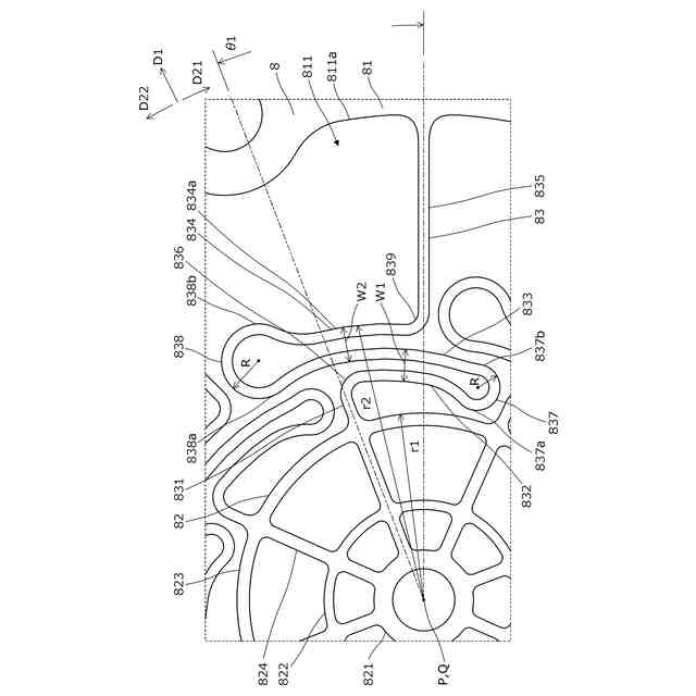前記第二折返し部は、前記回動中心よりも前記内縁側に膨出し、