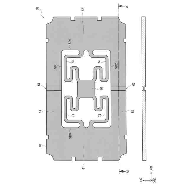 応力緩和部として上面にのみスリットを設けた支持基板の平面図及び断面図。