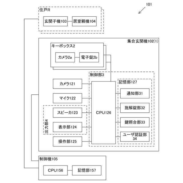 実施例1では、鍵貸出システム1は、集合玄関機102に搭載されている。