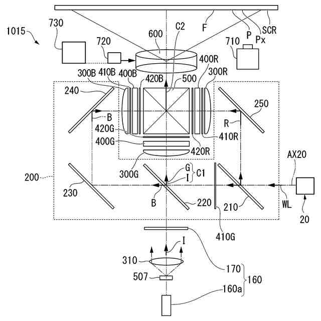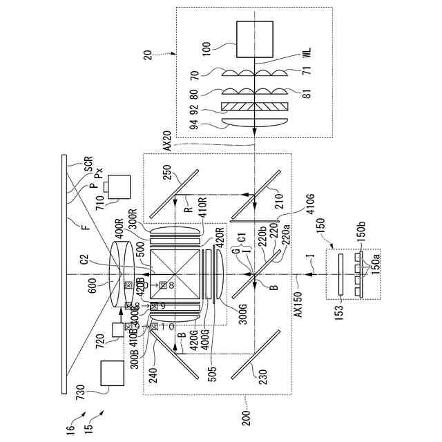 プロジェクションシステム16は、プロジェクター15と、撮像装置710と、を有する。プロジェクター15は、前方に配置されるスクリーンSCRに所定のパターンFを含む赤外光Iの投射画像Pxと可視光の投射画像Pとを重畳して投影する。プロジェクター15の構成については、後段において詳細に説明する。