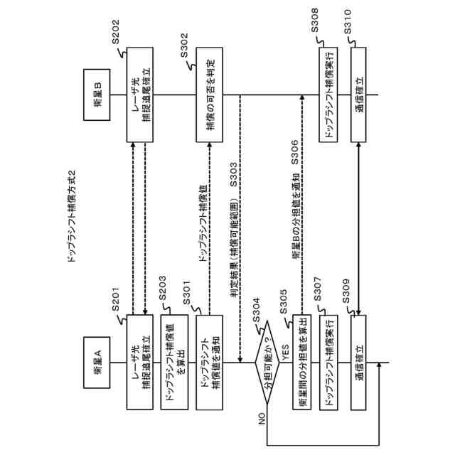 本開示の一実施形態によれば、衛星間で光捕捉追尾を確立した後、ドップラシフト補償方式を決定し、そのドップラシフト補償方式に従って衛星間でドップラシフト周波数の補償を分担する。ドップラシフト補償方式としては、1)ドップラシフト周波数を受信側衛星で補償できる場合は受信側衛星がドップラシフト補償を担当し、補償できない場合は自局衛星が送信光の周波数を変更可能な第1周波数範囲内でドップラシフト補償を担当する方式、および2)ドップラシフト周波数の大きさに依存して衛星間のドップラシフト補償の分担を決定する方式がある。すなわち、受信側衛星で、あるいは送信側および受信側の双方の衛星でドップラシフト周波数の補償を分担する。これにより効率的なドップラシフト補償が可能となる。