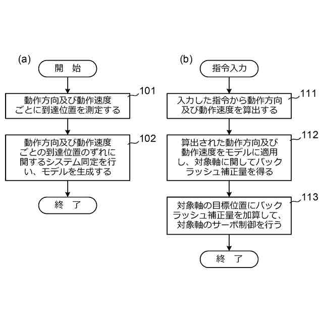 【解決手段】ロボットの軸ごとに動作方向と動作速度とを変えて第1の目標位置に対してロボットを動作させたときの到達位置を測定し(ステップ101)、動作方向と動作速度と第1の目標位置から偏差とに関するシステム同定を行ってモデルを生成する(ステップ102)。ロボットに対する指令が入力したときに、指令から動作方向と動作速度とを算出してモデルに当てはめ、バックラッシュ補正量を取得し(ステップ111)、指令によって指定された目標位置に対しバックラッシュ補正量を加算し(ステップ112)、補正後の目標位置を用いてサーボ制御を実施する(ステップ113)。