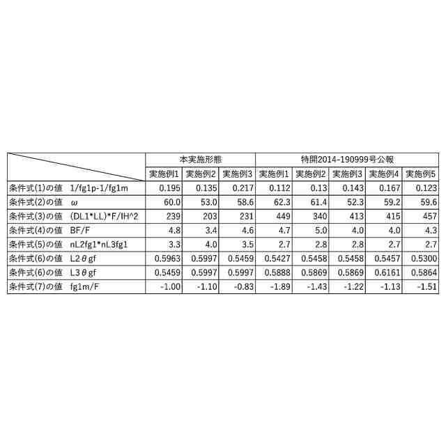 ここで、値fg1pは第1サブレンズ群の合成焦点距離であり、値fg1mは第2サブレンズ群の合成焦点距離であり、値ωは投写レンズの最大半画角であり、値IHはイメージサークルであり、値DL1は最もスクリーン側にあるレンズの有効半径であり、値LLはレンズ全長であり、値Fは全レンズの合成焦点距離であり、値BFは空気換算長のバックフォーカス距離である。