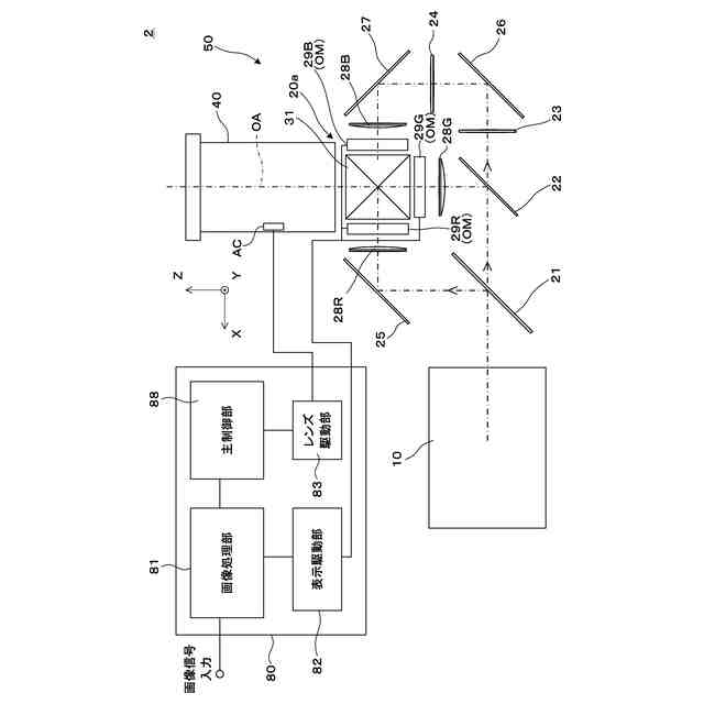 図1に示すように、実施形態に係る投写レンズ40を組み込んだ投写装置2は、画像光を投射する光学系部分50と、光学系部分50の動作を制御する回路装置80とを備える。