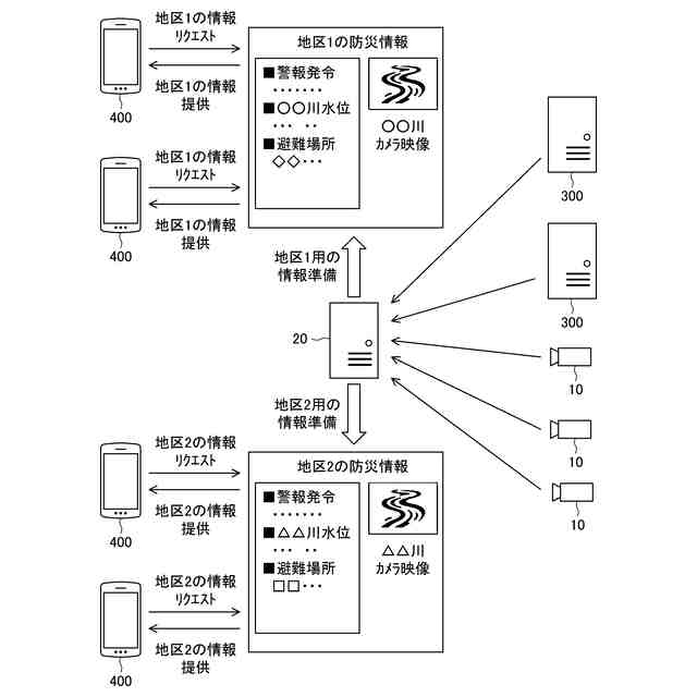 また、多くの防災情報プラットフォームは、利用者からアクセスがあるとその都度サーバが監視機器やデータベースから情報を取得して利用者に提供する、例えば、利用者から河川の画像が要求されるとその都度監視カメラから画像を取得してそれを利用者に提供する仕組みになっている。このため、災害発生時あるいは災害が発生しそうになると防災情報を求める利用者からのアクセスが集中して監視機器とサーバ間の通信量が増加し、結果としてシステム全体の負荷が大きくなって利用者へのスムースな情報提供ができなくなるおそれがある。