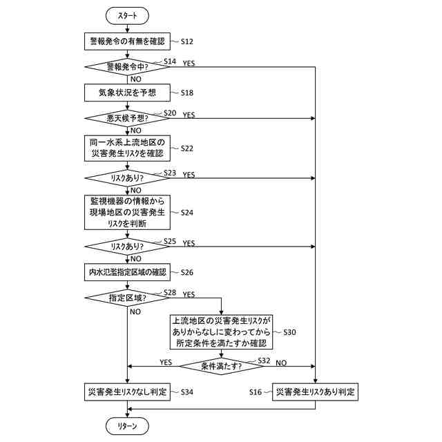 前記防災情報源から収集した一次的な防災情報および前記監視機器から受信した現場の状況の少なくとも一つに基づいて各地区の災害発生リスクの有無を判定する機能と、