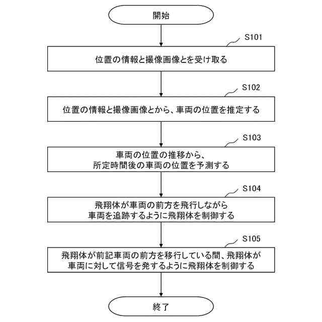前記飛翔体が前記車両の前方を飛行している間、前記飛翔体が前記車両に対して信号を発するように前記飛翔体を制御する、