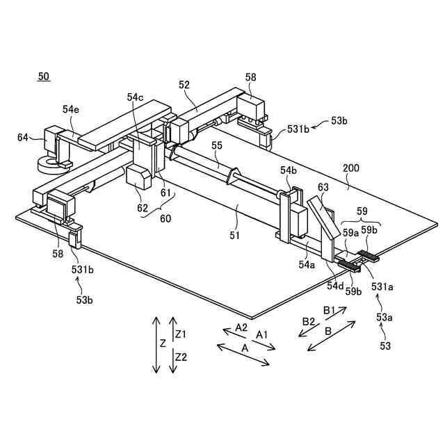 従来、ワーク搬送ロボットが開示されている。特許文献1には、工業用ロボットが開示されている。工業用ロボットは、ワーク保持装置を備えている。ワーク保持装置は、ワークとなるガラス基板を保持する。ガラス基板は、矩形形状を有する。ワーク保持装置は、第1の挾持手段と、第2の挾持手段と、を含む。第1の挾持手段は、爪を有する。第1の挾持手段の爪は、第1の方向からガラス基板の対向する2辺を挾持する。第2の挾持手段は、一対の回動アームを有する。一対の回動アームは、第2の方向からガラス基板の対向する2辺を挾持する。