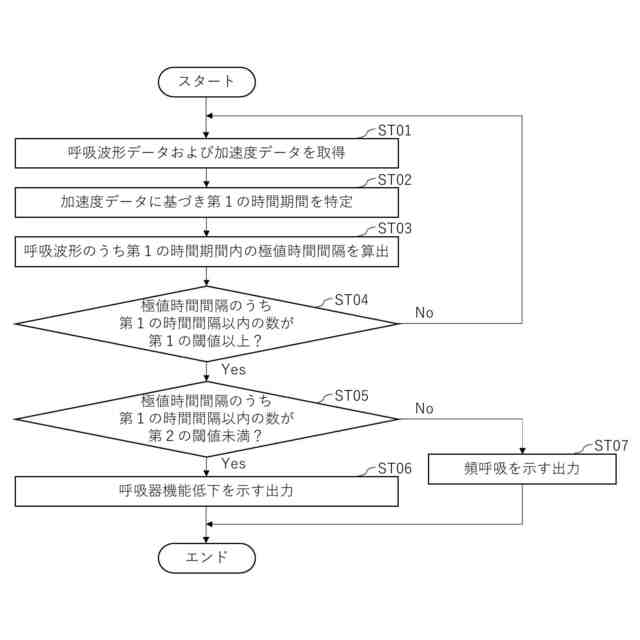 [7] 前記時間間隔を算出するステップにおいて、前記波形のうち前記第1の時間期間内の前記第1の種の極値または前記第2の種の極値に対応するタイミング情報を取得して前記時間間隔を算出する場合、前記第1の時間間隔は、前記ユーザが正常な呼吸状態にある場合の当該ユーザの呼吸の状態を示す波形で互いに隣り合う極大値の時間間隔の平均値あるいは互いに隣り合う極小値の時間間隔の平均値の5%以上45%以下の長さの時間間隔であり、