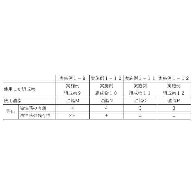 発明者は、特許文献2から、組成物中の油脂の含量が少なくとも、油性感を高めることができるような組成物が得られる余地がないか、考察した。すると、特許文献2では組成物の油脂の含量が多いことが特徴となっており、上述の考察を解決できるものではなかった。