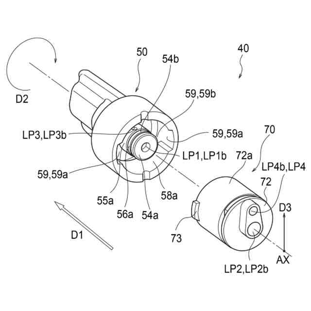 <12> 上記第1部品及び上記第2部品の一方は、上記軸方向と非平行な方向に突出した突出片を含み、上記第1部品及び上記第2部品の他方は、上記突出片が通過可能な誘導凹部を含み、上記誘導凹部は、上記軸方向に延びる第1部分と、上記第1部分に接続し上記軸方向と非平行な方向に延びる第2部分と、を含む、<1>~<11>のいずれか記載のコネクタ。