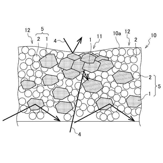 厚さ方向に直交する主面の一部に、前記大径無機粒子が偏在する第1領域を有するとともに、