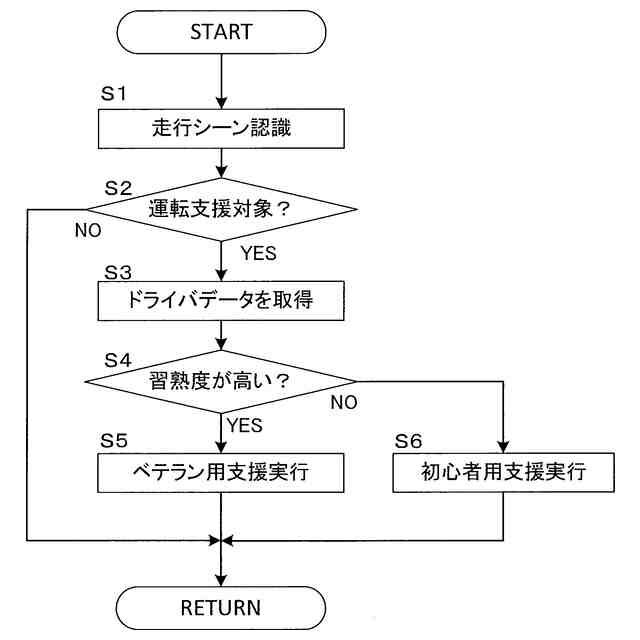 上記解決手法を前提とした好ましい態様は、特許請求の範囲における請求項2以下に記載の通りである。すなわち、前記支援態様設定手段は、走行中の走行シーンに関して習熟度が高いと判定されたドライバに対して、前記インターフェース手段による報知の態様を、運転操作自体に関する報知は行わず、車両挙動に関する報知を行う態様に設定する(請求項2対応)。この場合、習熟度が高いドライバ(ベテランドライバ)に対しては、ベテランドライバであれば無意識的に実行できる運転操作自体に関する不要な報知はなされない一方で、ベテランドライバにとっても有益な車両挙動に関する情報の報知はなされるので、ベテランドライバの適切な自立運転を促進することができ、ドライバの感情の良好化も効果的に達成できる。