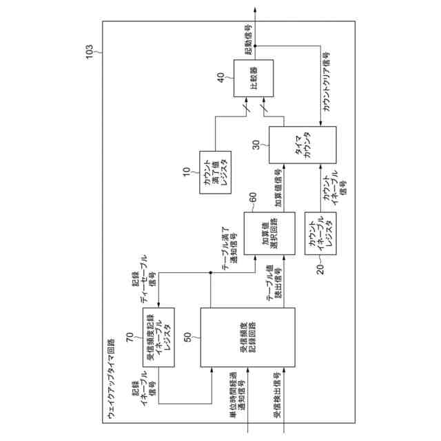 【解決手段】ウェイクアップタイマ回路103は、単位時間毎に受信電波を検出する頻度である受信頻度を記録する受信頻度記録回路50と、単位時間毎の受信頻度に応じて、加算値信号を変化させる加算値選択回路60と、加算値信号に応じて、カウント値をインクリメントするタイマカウンタ30と、カウント値と予め定めたカウント満了値とを比較し、カウント値がカウント満了値以上になった場合に、起動信号を出力する比較器40と、を備える。
