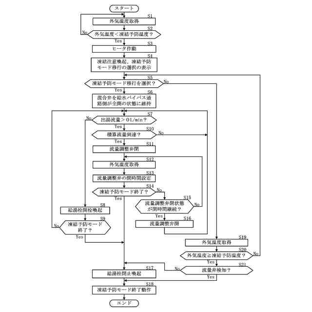 上記構成によれば、凍結予防モード中に外気温度が凍結の虞がない温度に上昇した場合には、流量調整弁を閉じたままにして給湯栓から排水しない。従って、ユーザの給湯栓の操作によらずに、排水されて無駄になってしまう水量を削減することができる。