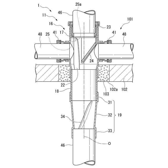 従来、集合住宅やオフィスビルディング等の建築物は、排水路等の集合継手システムを備えている(例えば、特許文献1参照)。例えば、集合継手システムは、建築物の各階で排水を集める横管と、各横管で集めた排水を下方に向かって流す縦管と、横管と縦管とを接続する集合継手と、を備えている。
