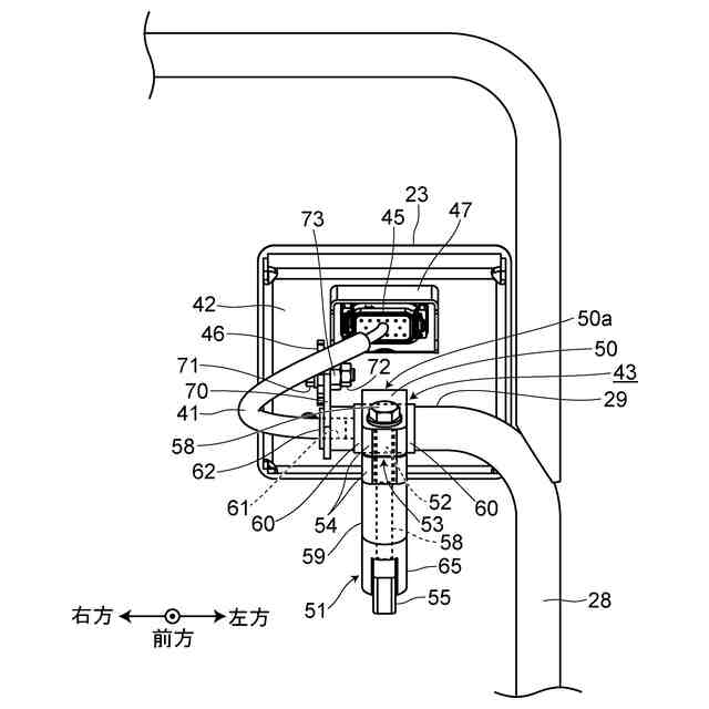 また、作業用車両において、コントローラを内蔵した装置本体部に立てられたフレキシブルなアームによって支持されているディスプレイ装置が開示されている(例えば、特許文献2参照)。このディスプレイ装置は、アームの上端部にボールジョイントによって回動可能に結合されている。アームは、帯状の金属板を螺旋状に形成したフレキシブルチューブによって形成され、内部にワイヤハーネスが挿通される。ディスプレイ装置は、ボールジョイント及びフレキシブルチューブで支持されていることから、ディスプレイ装置の表示画面部の角度及び位置を自在に調整することができる。