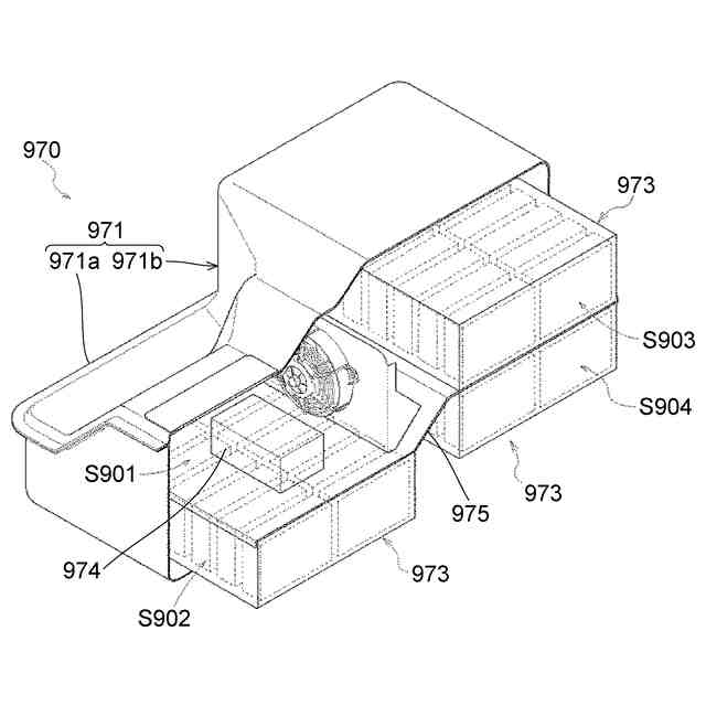 電装ユニット974は、第1空間S901と第2空間S902と第3空間S903と第4空間S904のうちのいずれか1つの空間に収容され、バッテリモジュール973は、第1空間S901と第2空間S902と第3空間S903と第4空間S904のうちの電装ユニット974を収容しない残りの空間に収容される。