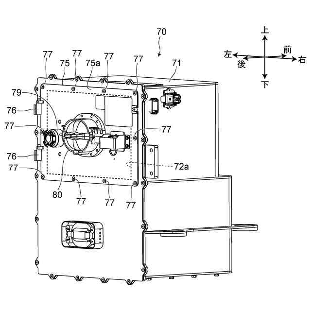 図7は、特許文献1に記載された、作業用車両に搭載されるバッテリパック970を説明するために示す図である。バッテリパック970は、前ケース部971aと後ケース部971bとからなる密閉されたバッテリケース971と、前ケース部971aの内部を上下方向で第1空間S901と第2空間S902とに区分けするとともに、後ケース部971bの内部を上下方向で第3空間S903と第4空間S904とに区分けする水平仕切り壁975と、電装ユニット974とバッテリモジュール973とを備える。