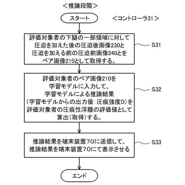 【解決手段】身体の下腿の圧痕性浮腫を評価するための学習モデルの生産方法は、複数の被検者のそれぞれについて、下腿の一部領域に対して所定期間に亘って圧迫を加えた後の圧迫後画像240と当該圧迫を加える前の圧迫前画像230とで構成されるペア画像210を取得するステップ(S11)と、複数の被検者のそれぞれの圧迫後画像240における圧痕強度Dの正解ラベルを取得するステップ(S12)とを備える。当該生産方法は、各被検者のペア画像210と当該各被検者の圧痕強度Dの正解ラベルとを備えて構成される教師データを用いて、学習モデルにおけるペア画像210と圧痕強度Dとの関係を機械学習するステップ(S13)をさらに備える。