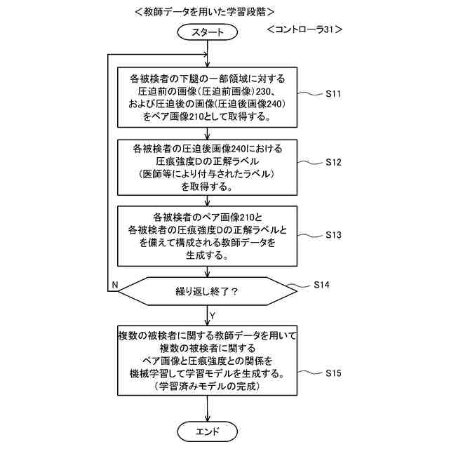 b)前記複数の被検者のそれぞれの前記圧迫後画像における圧痕強度の正解ラベルを取得するステップと、