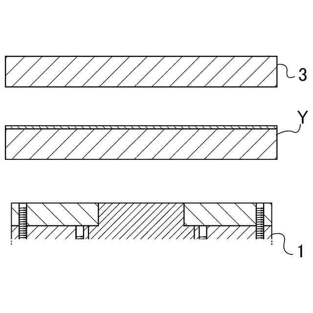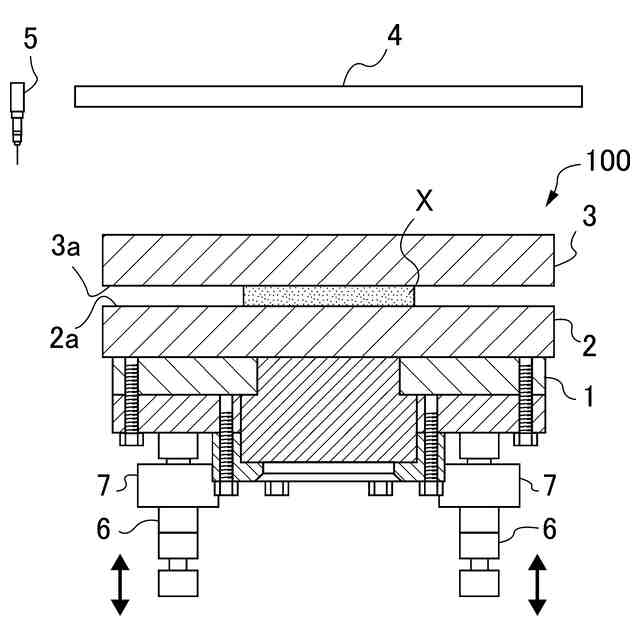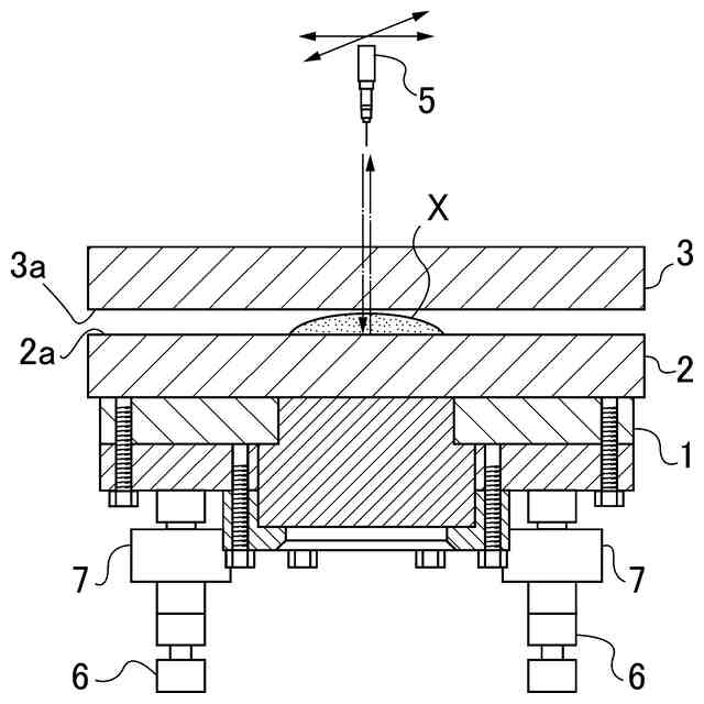 工程C) 前記基材の液材接触面と前記基板の液材接触面の何れか一方の液材接触面内に所定の半径の同一円の円周上の少なくとも3点の測定基点を設定して各測定基点から他方の液材接触面までの間隔を測定し、各測定値との差が式(1)を満たすように、前記基材又は/及び基板の傾きを調節する工程。
