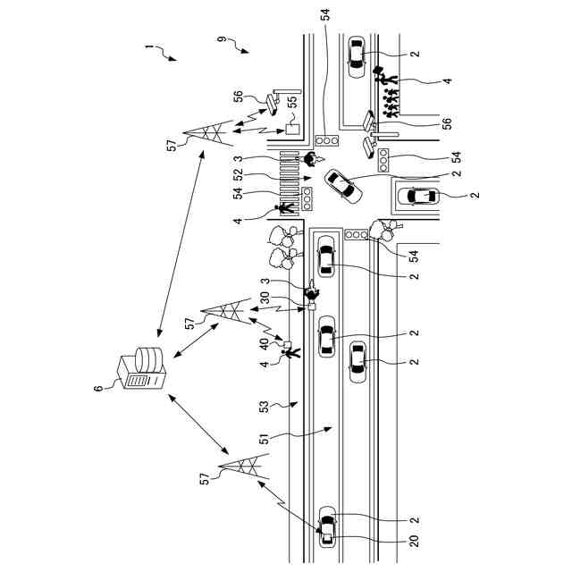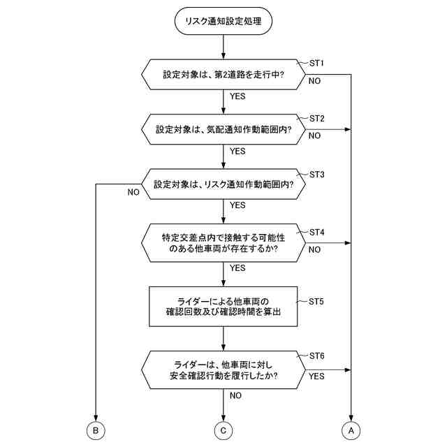 (1)本発明に係る交通安全支援システムは、鞍乗型車両(例えば、後述の自動二輪車3)である支援対象のライダーによる運転を支援するものであって、前記支援対象の周囲における交通参加者及び交通環境を認識する認識手段(例えば、後述の対象交通エリア認識ユニット60)と、前記ライダーが認知可能な態様で作動するマンマシンインターフェース(例えば、後述のHMI320)と、前記ライダーの頭部運動状態情報を取得する運転特性取得手段(例えば、後述のライダー状態センサ33及び運転主体情報取得ユニット61)と、前記認識手段によって前記支援対象又は前記支援対象の進行方向前方を中心とする第1範囲(例えば、後述のADAS作動範囲B1)外に他移動体(例えば、後述の他車両V)の存在が認識されている間、前記認識手段による認識結果及び前記頭部運動状態情報に基づいて第1通知作動条件(例えば、後述のアナログ通知作動条件)の成立の有無を判定する判定手段(例えば、後述のリスク通知設定ユニット64)と、前記判定手段によって前記第1通知作動条件が成立したと判定された場合、第1通知態様(例えば、後述のアナログ通知モード)で前記マンマシンインターフェースを作動させる通知制御手段(例えば、後述のHMI制御装置325)と、を備え、前記判定手段は、前記他移動体が移動する第1道路(例えば、後述の第1道路R1)と前記支援対象が移動する第2道路(例えば、後述の第2道路R2)とが各々の進行方向前方の特定交差点(例えば、後述の特定交差点P)において交差する場合であり、かつ前記支援対象が前記特定交差点を中心として定められかつ前記第1範囲を包含する第2範囲(例えば、後述のアナログ通知作動範囲B2)内に存在する間に、前記ライダーによる前記他移動体に対する確認行動が行われなかった場合、前記第1通知作動条件が成立したと判定することを特徴とする。