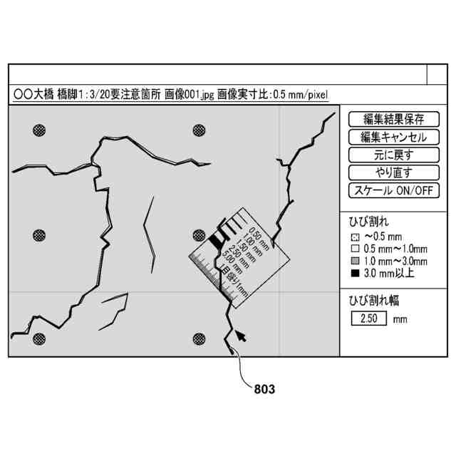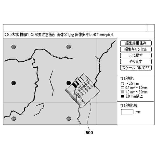 特許文献1及び2は、ユーザが撮像画像上のひび割れ幅を計測することを容易とする技術を開示している。特許文献1は、ひび割れ幅を測定するための線画が付されたスケール画像を構造物の画像に重畳する際に、スケール画像の位置及び向きを、構造物の画像におけるひび割れの位置及び方向に応じて設定することを提案している。また、特許文献2も、実空間における物体の大きさの尺度を示すオブジェクトを構造物の画像に重畳することを提案している。