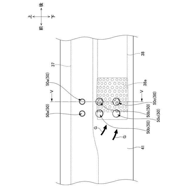 また、前記連通孔(50a,50b,50c)は、前記マフラ(33)の側面視で、前記インナパイプ(37,38)の端部の近傍に形成されている点に第2の特徴がある。