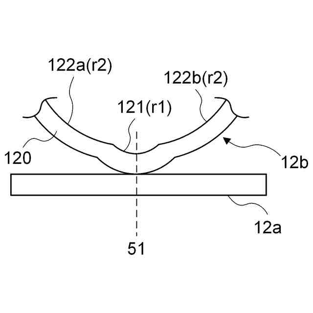 前記第1凸部の前記溶接ラインに直交する断面における形状は、前記溶接ラインの一方の側においては半径r1の第1円弧領域であって、前記溶接ラインの他方の側においては半径r2の第2円弧領域であり、