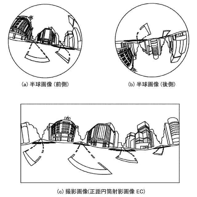 (a)は撮影装置で撮影された半球画像(前)、(b)は撮影装置で撮影された半球画像(後)、(c)はメルカトル図法により表された画像を示した図である。