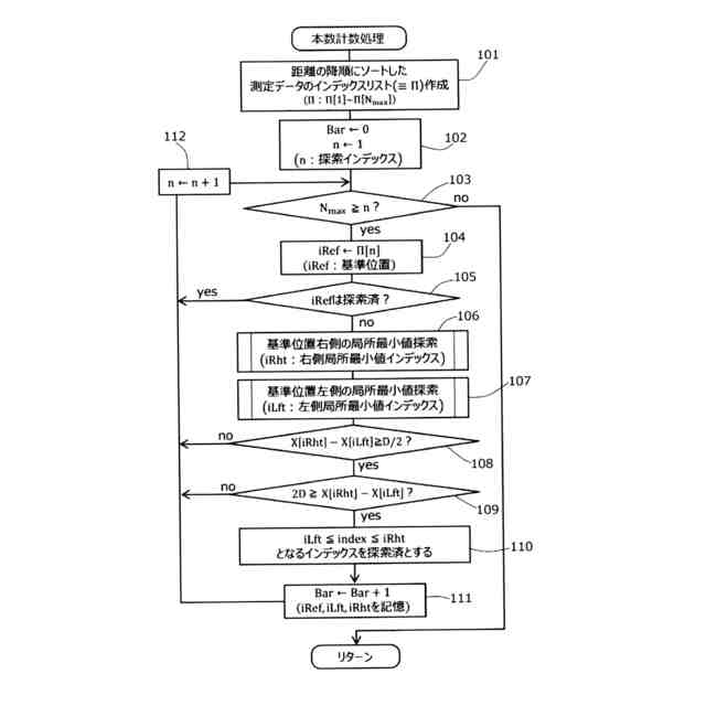 【解決手段】整列させられた複数の丸棒体の上半外周の高さデータを、整列方向へ一定間隔で取得し、得られた高さデータのうち最も高い位置を基準位置として、基準位置を境に丸棒体の直径から定められる所定範囲内で整列方向の正側と負側でそれぞれ高さが極小ないし最小となる位置を特定して、負側の極小位置ないし最小位置から基準位置を経て正側の極小位置ないし最小位置に至るまでの範囲を一の丸棒体の存在範囲として丸棒体の本数に加算し、一の丸棒体の存在範囲にある高さデータを除いて残る高さデータのうち最も高い位置を次の基準位置として、次の基準位置を境に丸棒体の直径から定められる所定範囲内で整列方向の正側と負側でそれぞれ高さが極小ないし最小となる位置を特定して、次の丸棒体の存在範囲として丸棒体の本数に加算し、丸棒体の本数を算出する。